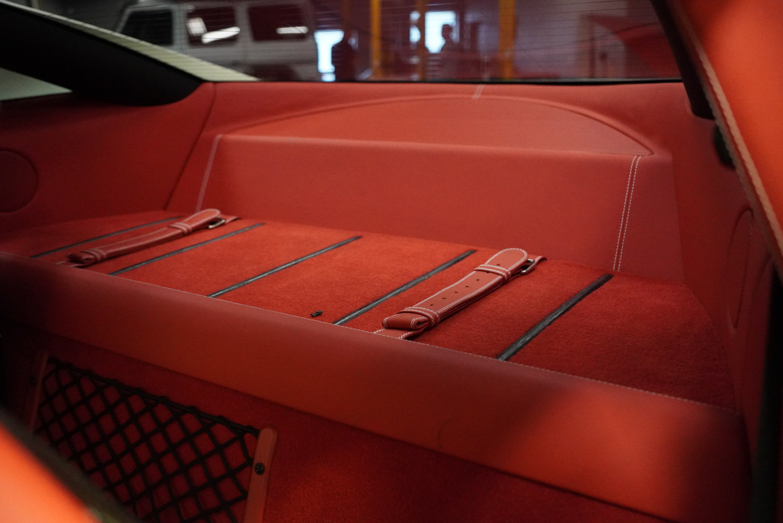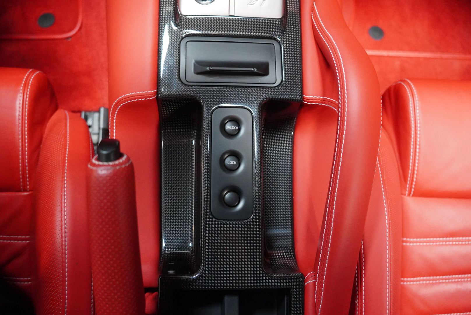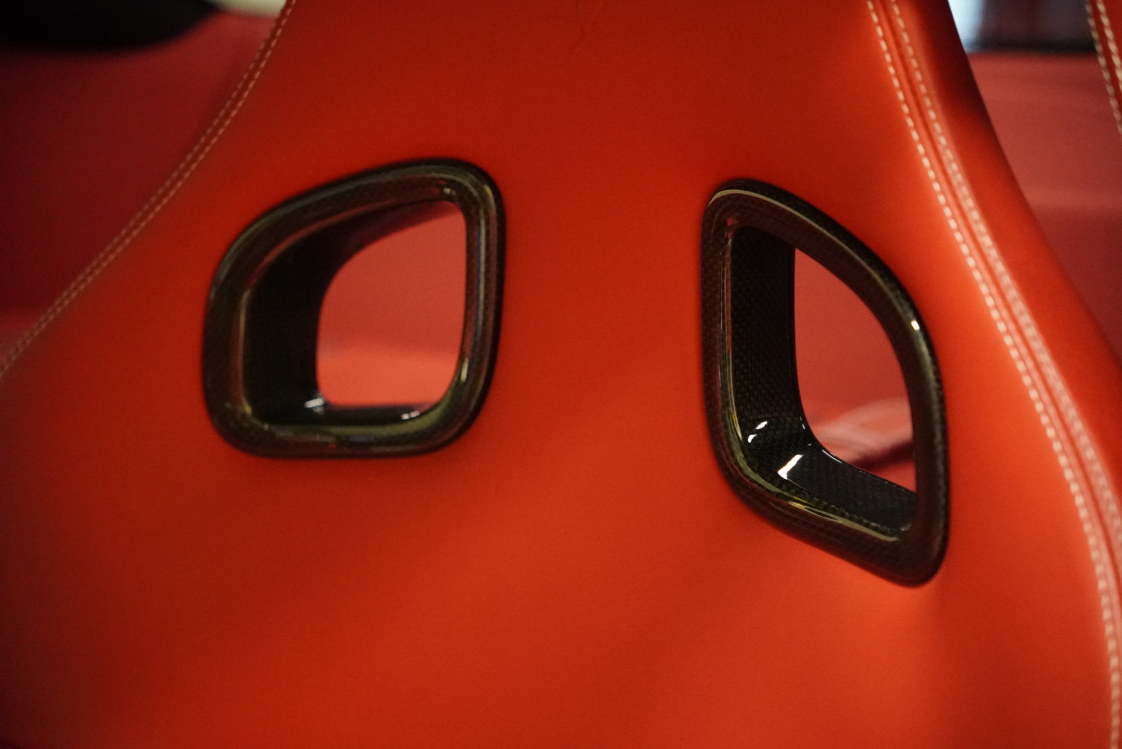 The cabin is finished in Rosso leather with white contrast stitching, featuring the Carbon Fiber interior, creating a bold yet refined atmosphere that embodies Ferrari’s craftsmanship.