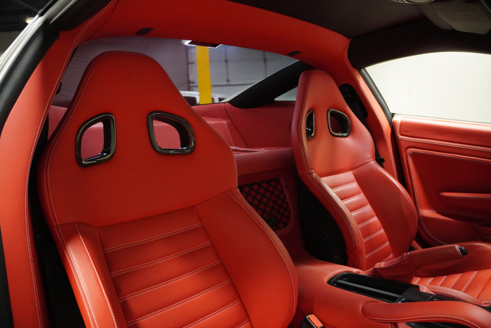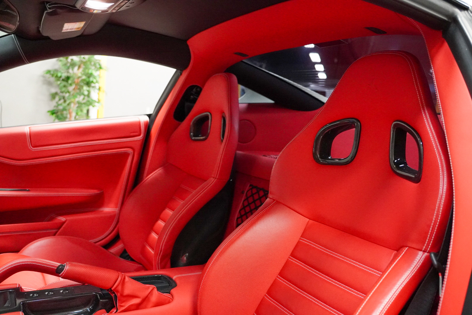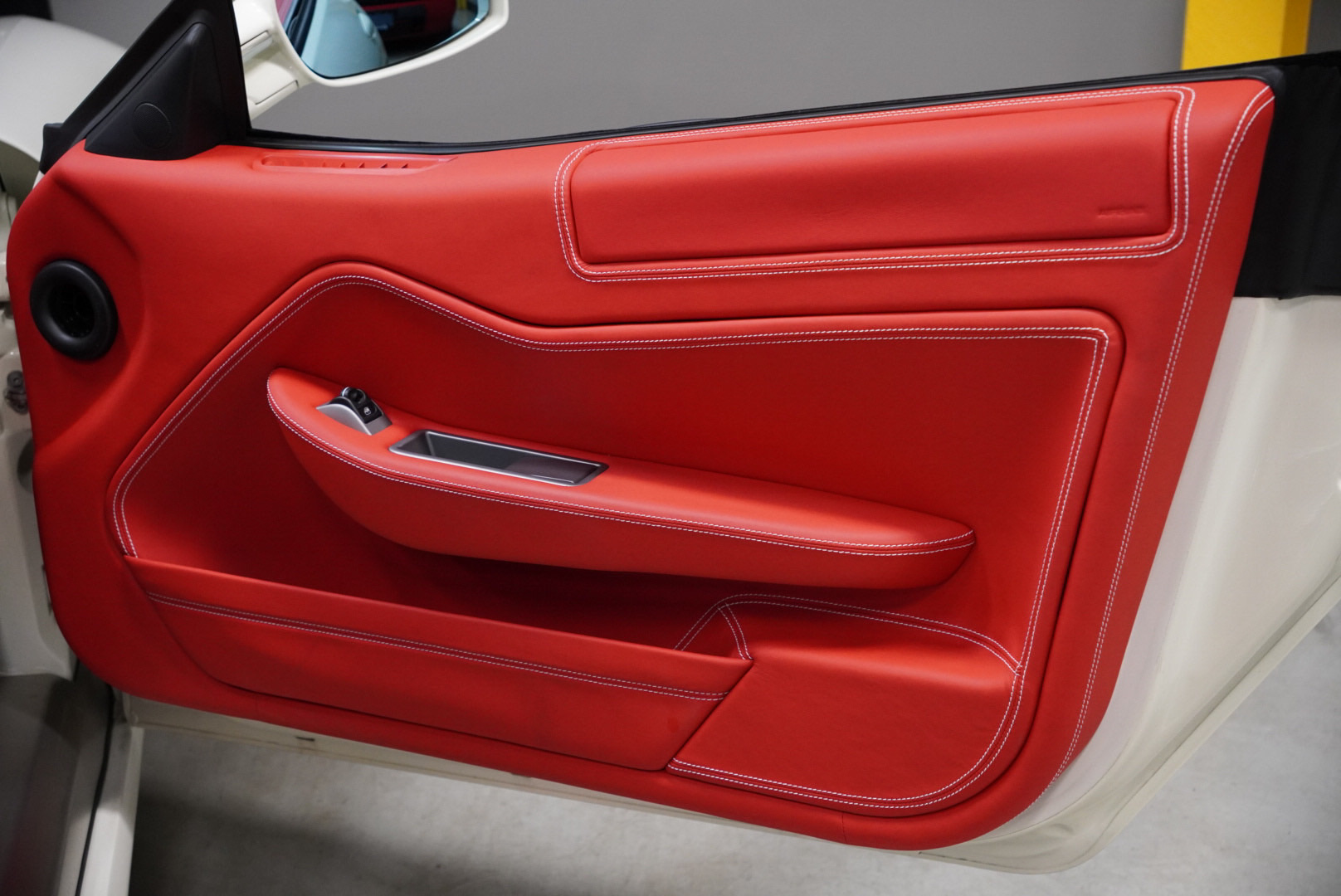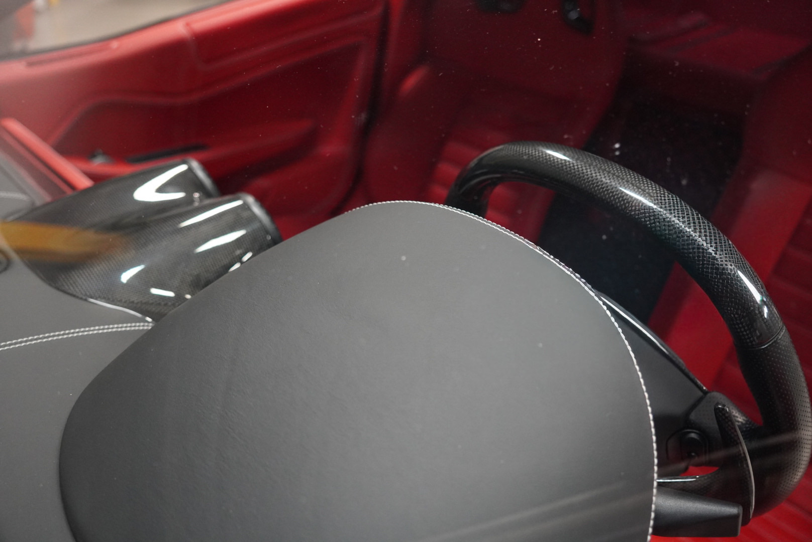 The cabin is finished in Rosso leather with white contrast stitching, featuring the Carbon Fiber interior, creating a bold yet refined atmosphere that embodies Ferrari’s craftsmanship.